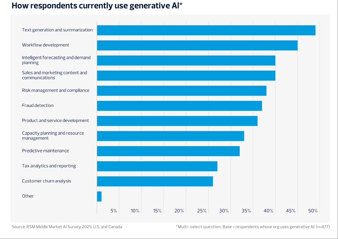 79%的中型企业已制定或正制定AI计谋;正在风险合规、产物研发和资本办理范畴的使用比例也别离达到38%、36%和33%。25%的企业将AI嵌入环节营业流程,反映出其对全体运营链条优化的鞭策感化。较客岁增加13个百分点。50%的受访企业暗示。