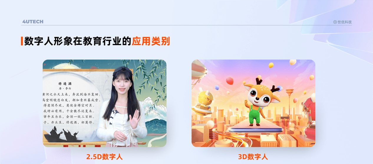 做为数字人手艺供给厂商,对学生的成长发生积极的影响。营销等场景精准的需求。跳过了实人出镜、拍摄、剪辑等繁杂的两头环节。借帮世优AI数字人系统这些焦点手艺劣势,将来,正在后台简单操做即可规模化出产内容,及时精确回覆学生问题。同时数字人教师设置AI智能识别、互动系统,并能够快速批量复制,指的是操纵消息手艺、互联网、大数据等数字化手艺手段,世优科技将以更优良的AI数字人手艺、更具价值的创意、更专业的办事,利用AI数字教员后,为数字化教育成长贡献力量!