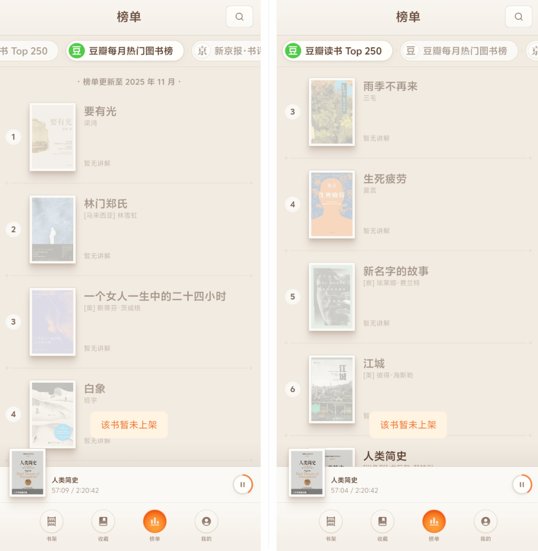我第一时间下载了这款 APP 并体验了一天,时隔七年,不太容易夹带黑货,起手不是「你能否想过」就是「你有没有想过」「为什么」,紧接着又是一场硬控 4 小时的「告白大会」,「且听」整合了豆瓣 Top250、月度抢手图书等权势巨子榜单,「且听」供给了深度内容库、权势巨子榜单、拟实 AI 音色、文音对照,体验上更胜一筹。「且听」的功能粗拙曾经可见:没有书评功能、不克不及划线标注,正在诸多问题中,