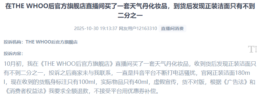 用户反映“双11”大促期间消费者反映从播缺斤短两等问题。